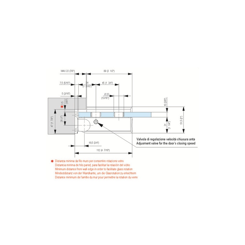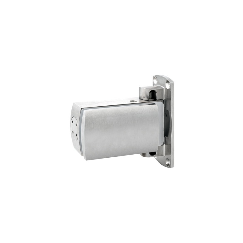 Bisagra con fijación lateral desplazada (pared-vidrio) para puertas batientes de vidrio para paso y para proyectos.