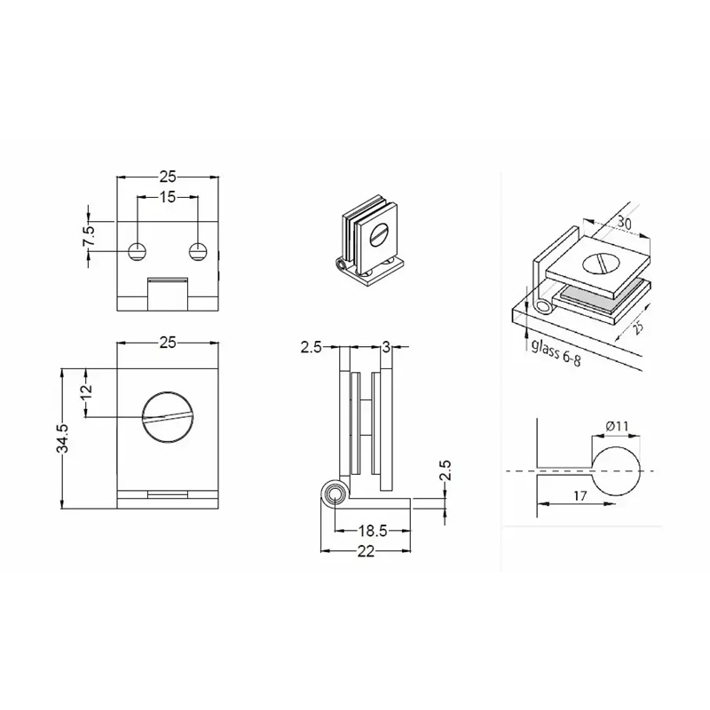 BISAGRA SI1506520-1 LATERAL MODELO «BOSCH» DE MEDIDAS 25X30MM VIDRIO-PARED PARA VIDRIO DE 6-8MM DE GROSOR